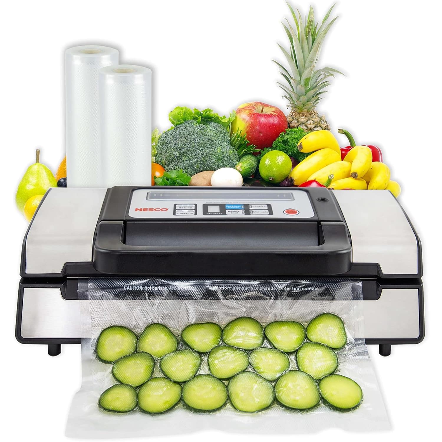 The double heat seal function provides extra security for longer storage periods and sous vide cooking applications, giving users confidence when storing expensive cuts of meat or preparing foods for extended freezer storage. Compatible with any brand of vacuum sealer bags, the NESCO offers flexibility in purchasing decisions and accommodates bags up to 11.8 inches wide for various food packaging needs.